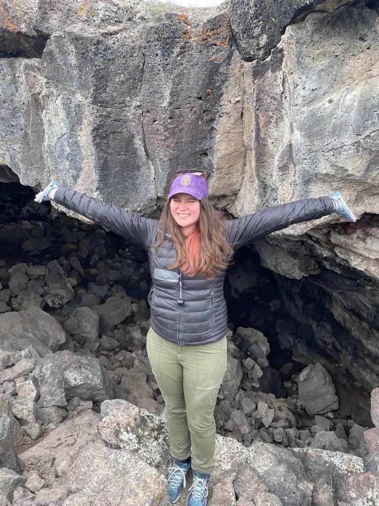 Image Description: Gwyn is a white woman with brown and pink hair. She is wearing a black jacket, purple Williams Geosciences hat, green pants, blue gloves, and blue hiking boots. She is smiling and celebrating in front of a lava tube in the Great Basin, Utah.