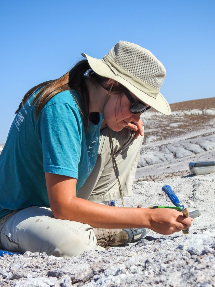 Image description: Letícia is smiling with fieldwork clothes in front of a reddish dirt at a paleontological outcrop.