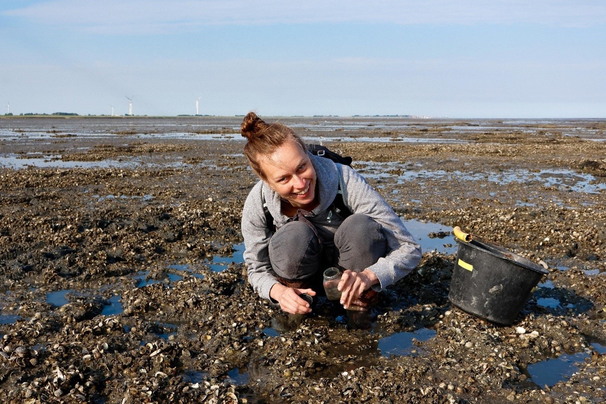 Image description: This is me (Vanessa) crouched beside a black bucket, collecting clams and snails at the German Wadden Sea.