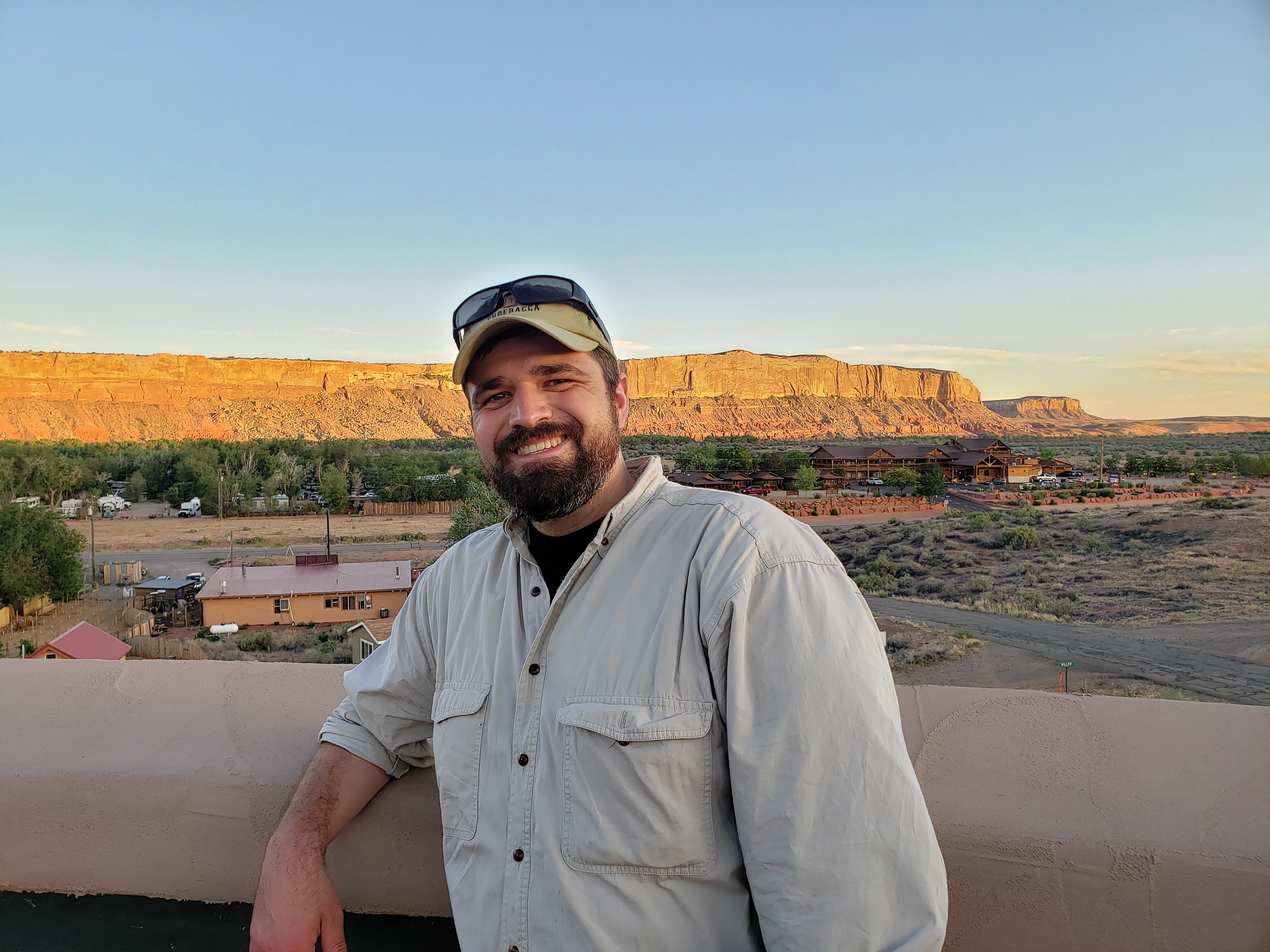 Image description: Picture of Jonathan a white man wearing a cap, field shirt and smiling with a backdrop of Colorado plateau at Bluff, Utah, USA.