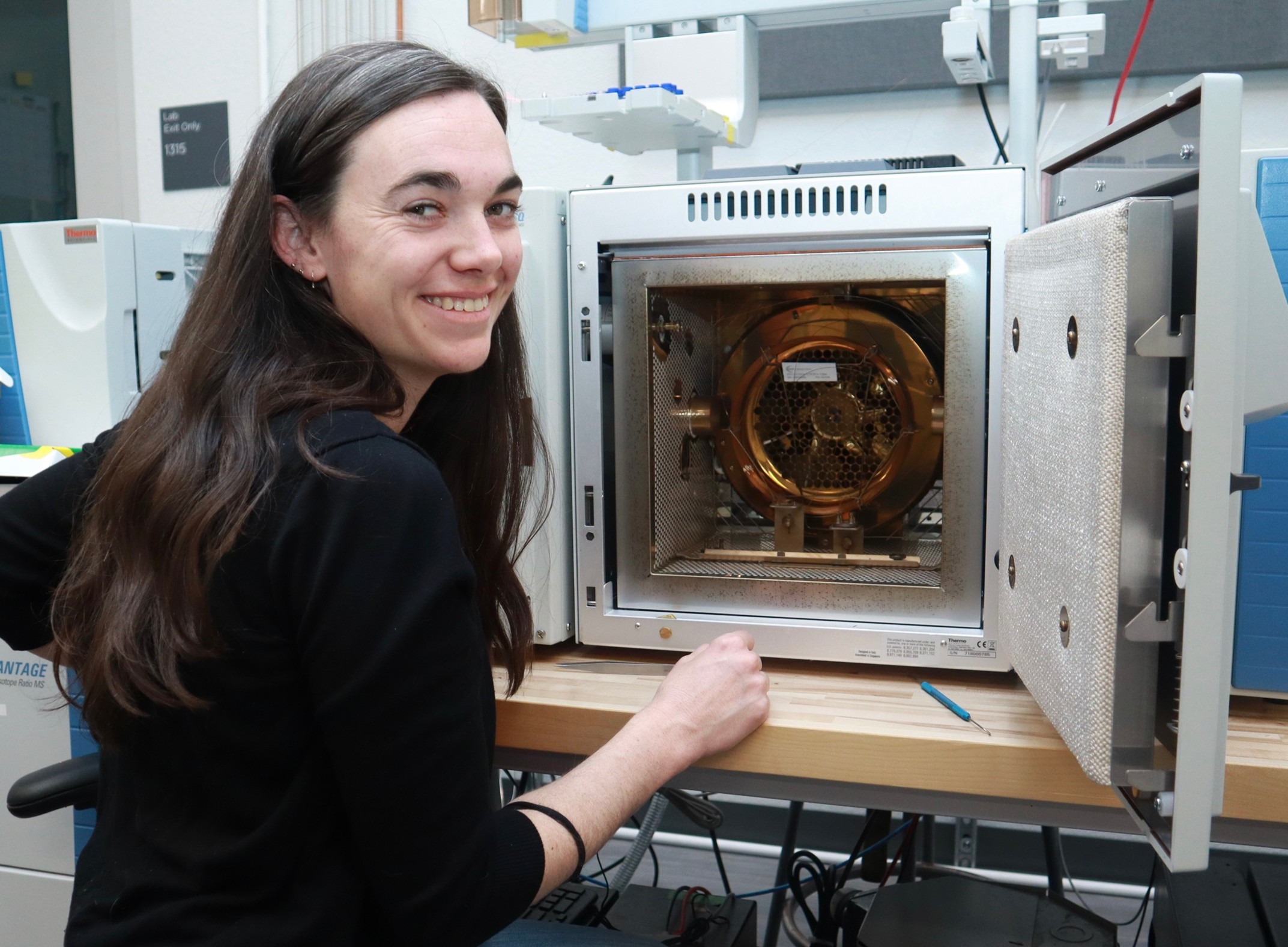 Image description: Dr. Emma A. Elliott Smith working on instrumentation for isotopic analysis; shown here is a Gas Chromatography Isotope Ratio Mass Spectrometer System at the University of New Mexico’s Center for Stable Isotopes. This instrument was used to measure δ13C values of individual amino acids from sea otter remains recovered from archaeological sites. Photo credit Jeng Hann Chong.