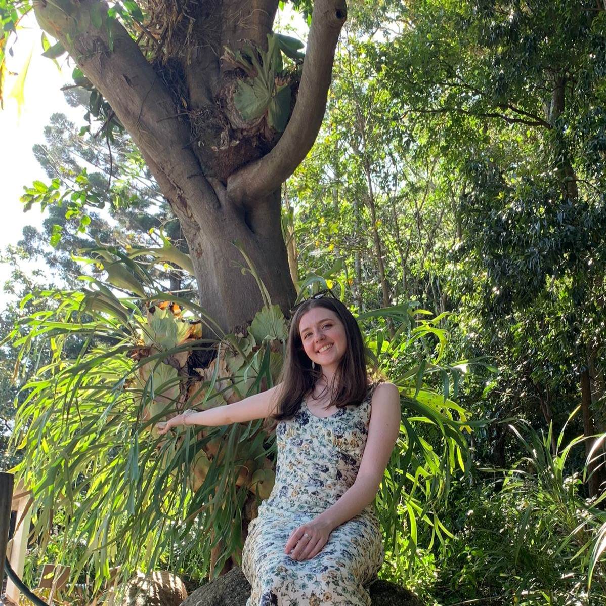 Image description: Holly-Anne, a white woman in a floral dress, sitting under a tree in the Brisbane Botanic Gardens.