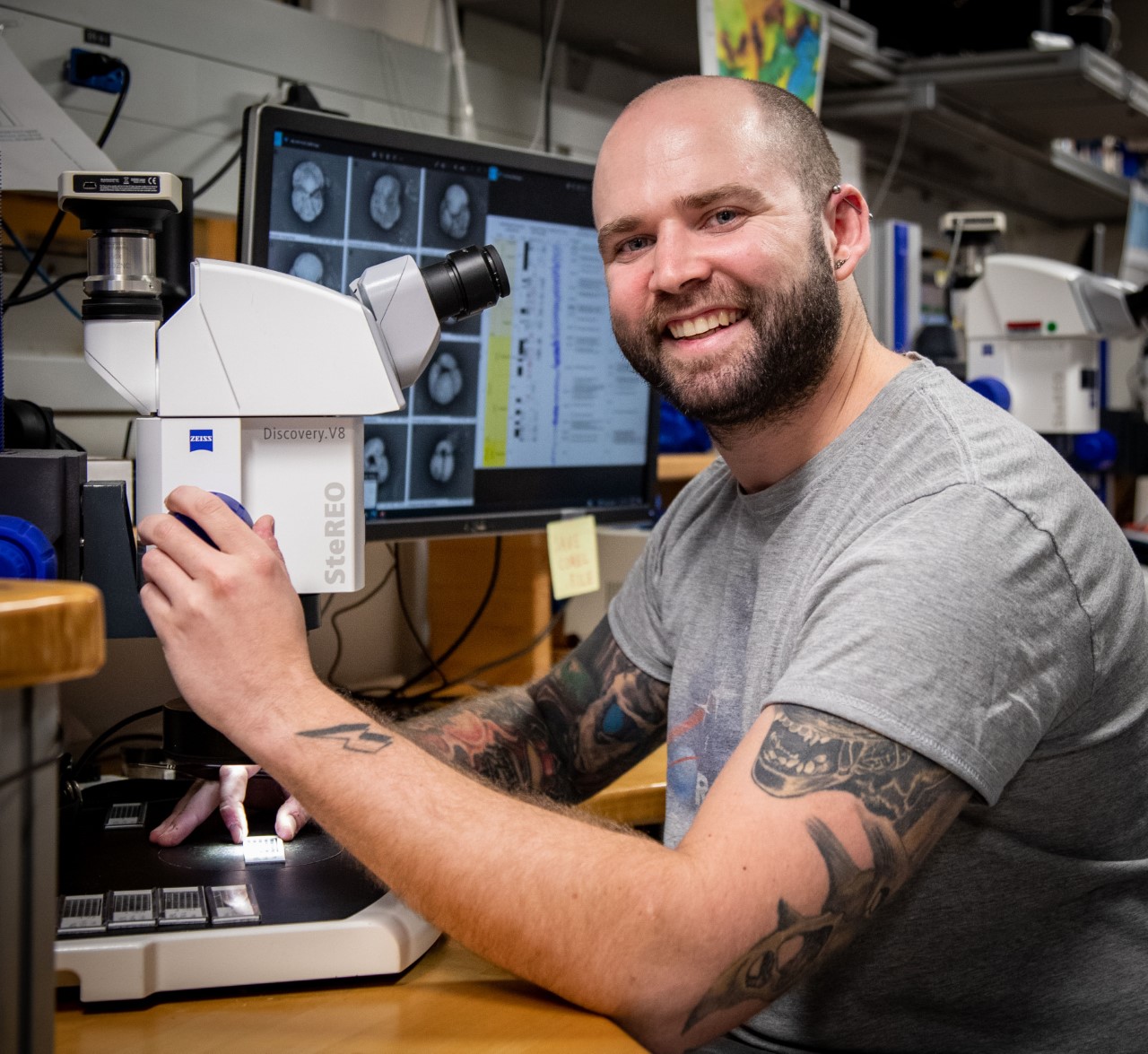 Image description: Adam using planktonic foraminifera to date sediments on IODP Expedition 398 in the Aegean Sea.